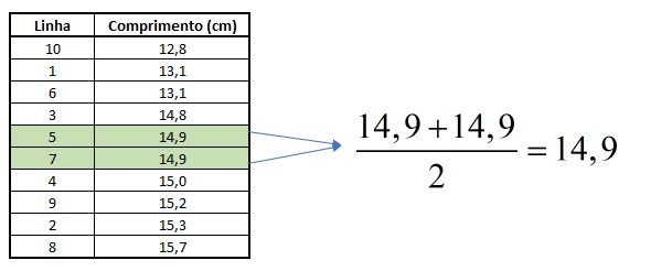 MEDIANA: A mediana é um terceiro tipo de medida de tendência. Para fazer o seu cálculo deve-se ordenar os números de forma crescente (ou decrescente, tanto faz) e pegar o elemento do meio. Caso se tenha dois elementos centrais, fazemos a média deles. A figura abaixo mostra o ordenamento dos valores dos comprimentos das linhas e o cálculo da mediana: