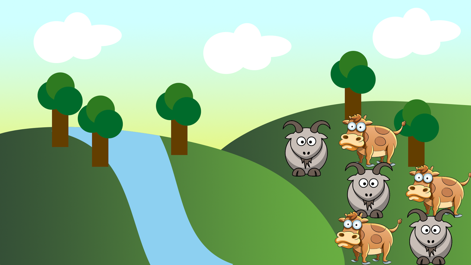 No desenho acima nós temos duas populações distintas. Uma população de bodes vivendo de um lado do córrego e uma população de vacas vivendo do outro lado. Se por algum motivo essas duas populações passam a viver juntas nós vamos ter outro nível de organização. Agora ao invés de duas populações teremos uma comunidade. A definição de comunidade é, portanto, o conjunto de indivíduos de diferentes espécies interagindo uns com os outros numa determinada região geográfica, num espaço de tempo.