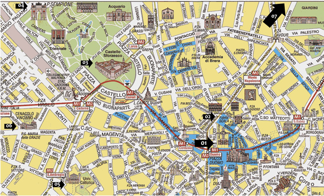 CASTELLO SFORZESCO (03 no mapa): E’ um dos principais símbolos de Milão e de sua história. Por esse motivo, os milaneses nutrem um sentimento de amor e ódio. O castelo foi construído no século XV por Francesco Sforza sobre restos de uma fortificação do século XIV. No século passado, o castelo assumiu um papel importante na cena cultural milanesa, tutelando importante obras da arte lombarda. Na segunda guerra mundial o castelo foi danificado por uma bomba e reestruturado depois do final da Segunda Guerra Mundial. Na década de 1990 foi construída na praça do castelo uma grande fonte inspirada em uma anteriormente instalada naquele lugar. Atualmente, o castelo é rico em museus com: Pinacoteca do Castello Sforzesco (uma riquíssima coleção de pinturas, entre as quais estão incluídas obras de Antonello da Messina, Andrea Mantegna, Canaletto, Correggio, Tiepolo e a magnífica estátua de Michelangelo, a Pietà Rondanini); Museu da Pré-história;Museu Egípcio; Museu de Arte Antiga; Museu do Móvel; Coleção de Arte Aplicada; Museu dos Instrumentos Musicais; Rivellino do Santo Spirito (excursão entre os telhados e as passagens cobertas nos muros exteriores do castelo; Biblioteca de Arte do Castello Sforzesco; e etc.