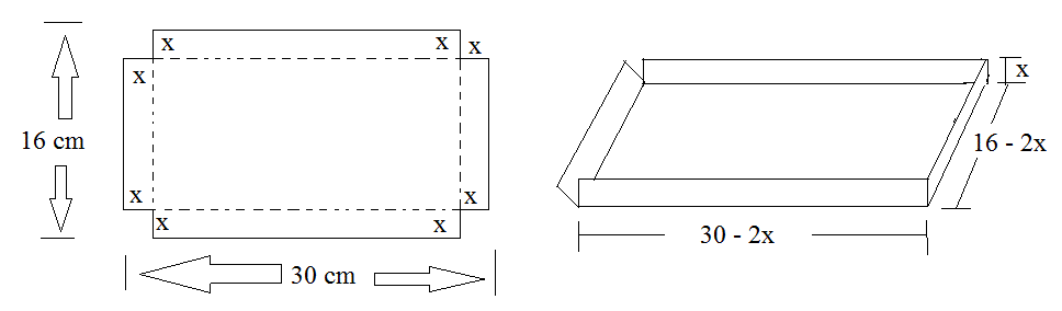 4)Uma folha de papelão labirinto que vai ser exposta em forma de um quadrado, este labirinto deve ser feita de uma folha de papelão medindo 16 por 30 cm, destacando-se quadrados iguais dos quatro cantos e dobrando-se os lados.Qual é o tamanho dos quadrados para se obter uma caixa com o maior volume?