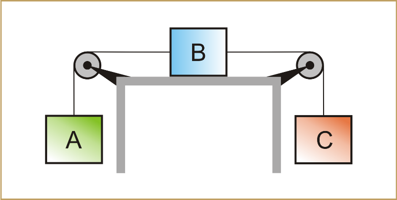 6)Calcule a aceleração do sistema e de o valor da tração 1 e da tração 2 , considere que não há atrito, e que as massas dos blocos A, B e C sao respectivamente 3kg, 4kg, 5kg e a gravidade neste ambiente seja de 10m/s²